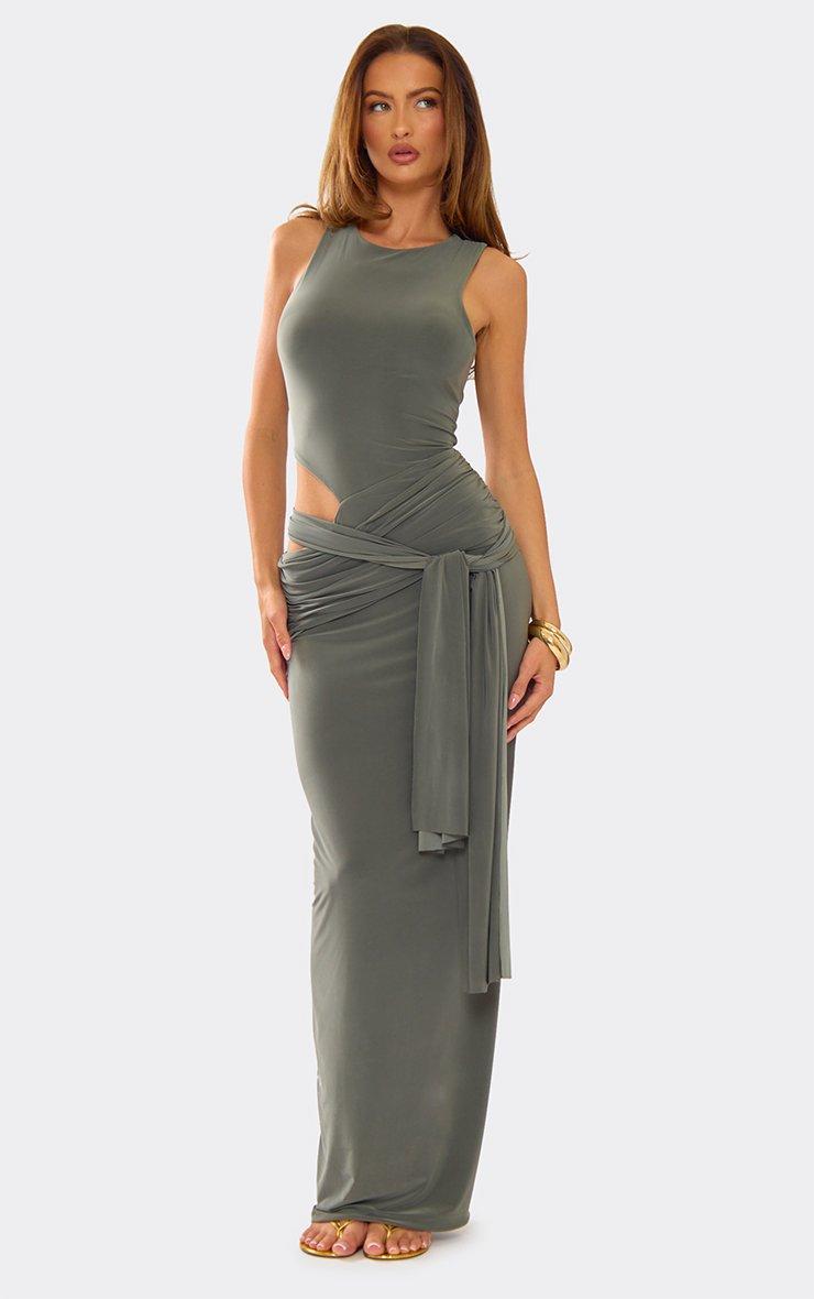 Sleeveless Cut Out Side Drape Maxi Dress In Khaki Green