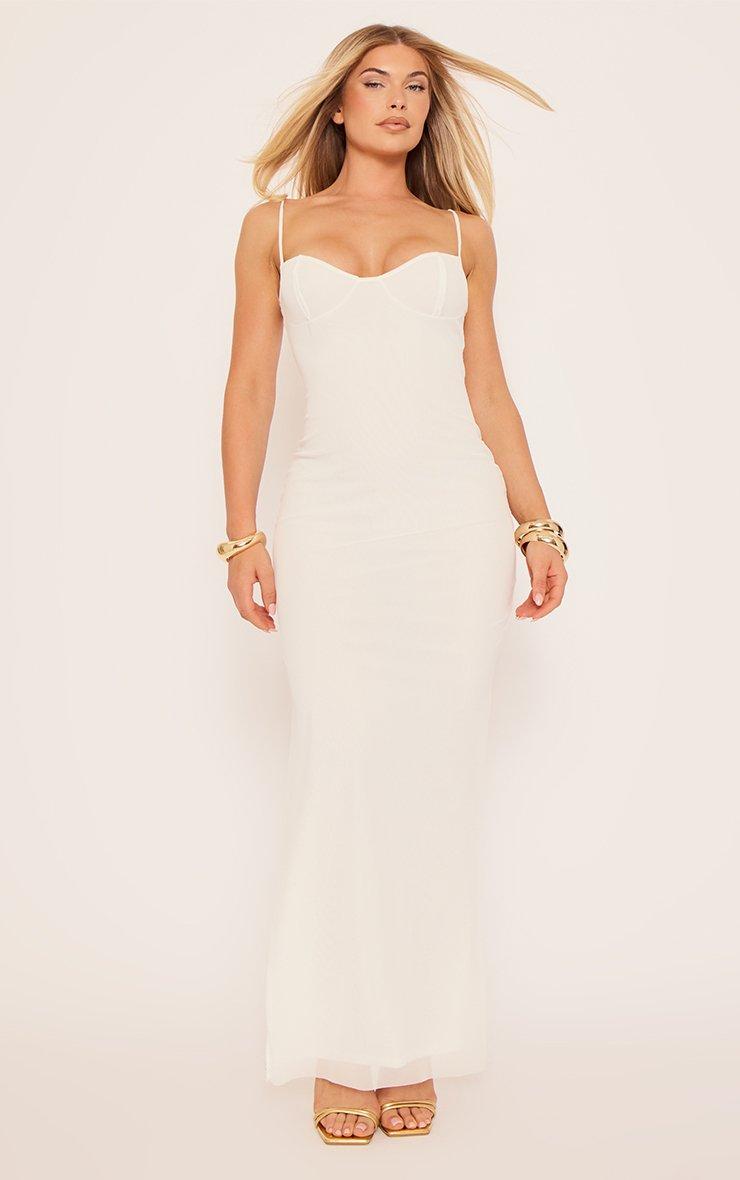 Deliver effortless elegance in this white mesh maxi dress. Serving next-level glam, this maxi dress boasts delicate fabric and a striking silhouette. Crafted in white mesh, it features thin straps and cupped support for a curve-hugging fit. The maxi length is pure glam while the split leg detail gives this white dress some subtle sexiness. Need an engagement party dress? Take centre stage in this white mesh maxi dress. Key Features White Mesh Fabric Delicate Straps Cupped Support Split Leg Detail Maxi Length Styling Notes Popped the question? Celebrate your love story in this white mesh maxi dress. Style your engagement party dress with gold block heels for a luxe look you can dance all night in. Finish the look with a statement clutch bag and delicate jewellery for an elevated engagement party outfit . Get ready to celebrate in this stunning white mesh maxi dress.
