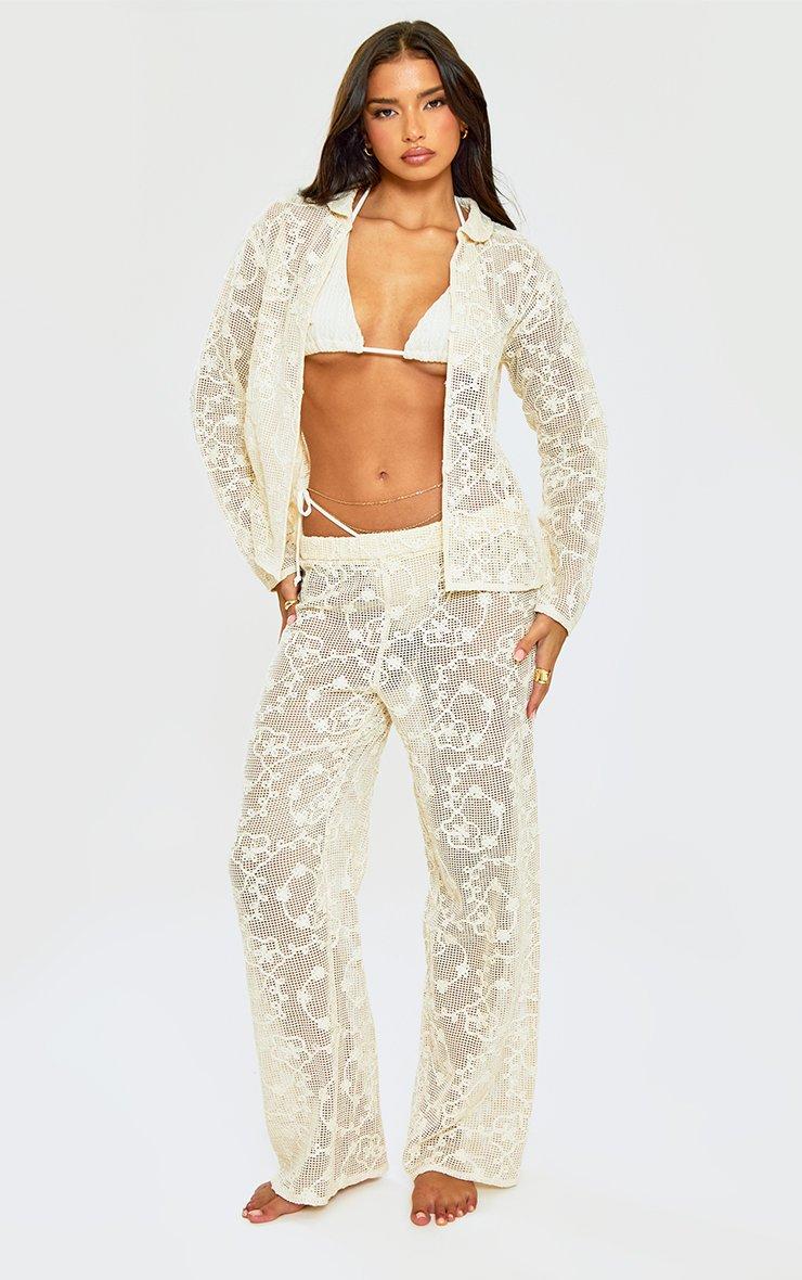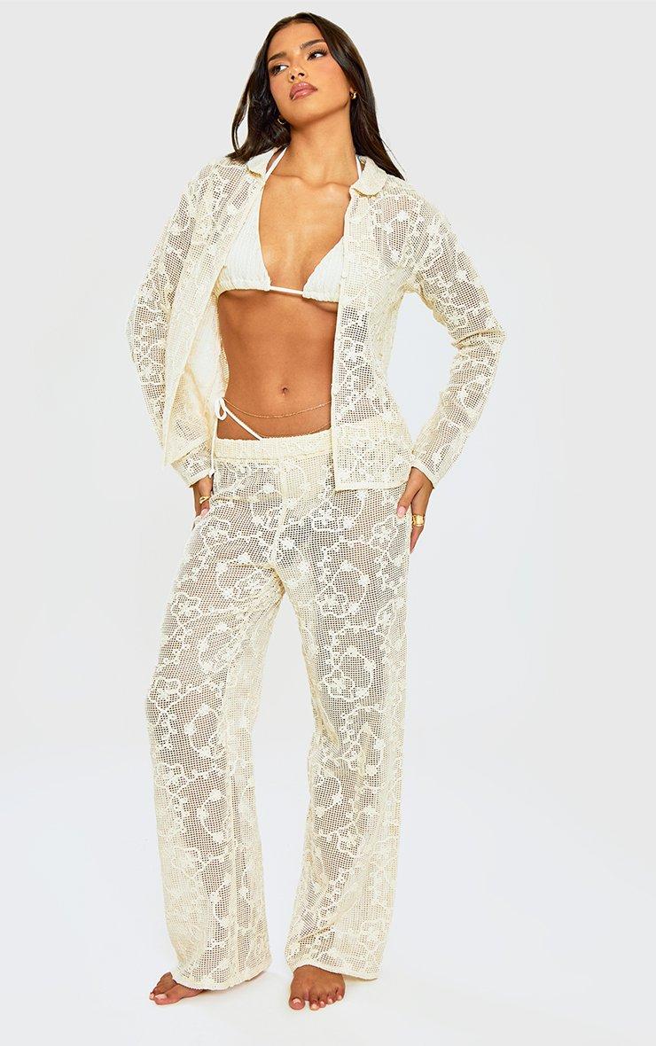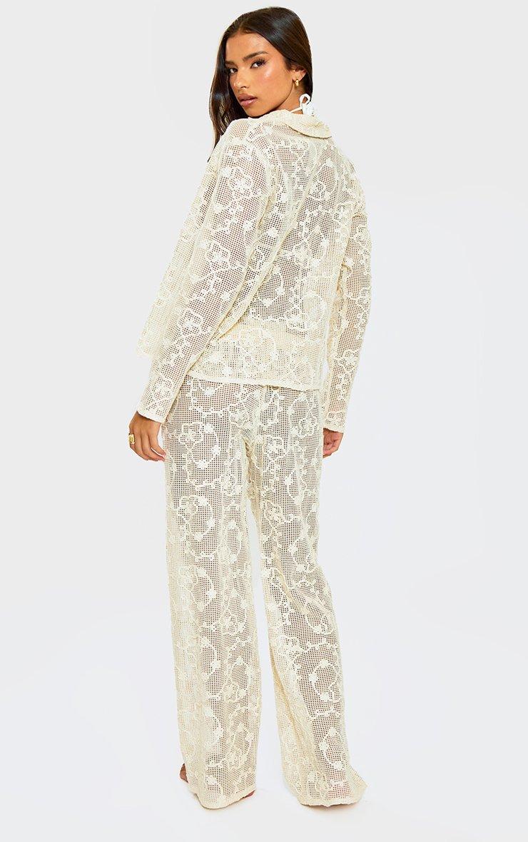Wide Leg Trousers In Stone Embroidered Crochet