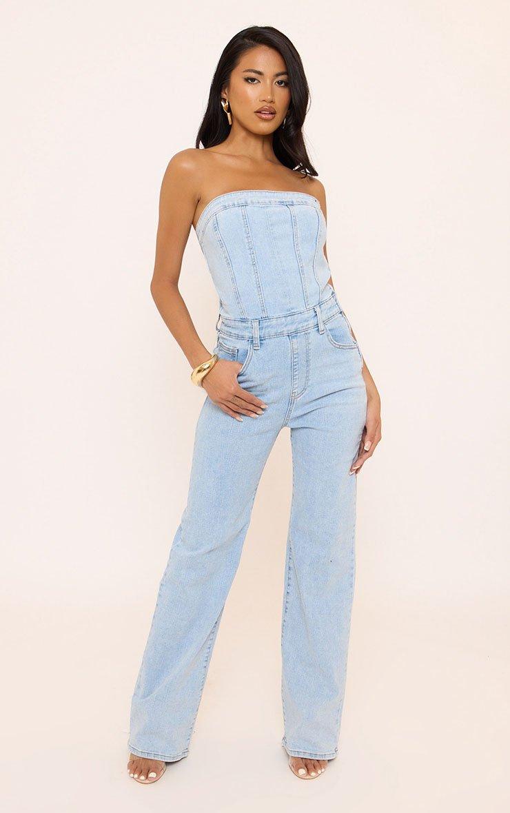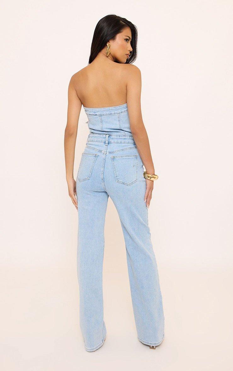 Ready for your next city stroll, doll? Featuring classic blue denim with sleek seam detailing, this bandeau straight-leg jumpsuit serves up effortless cool with a chic, bold edge.