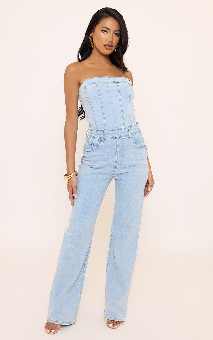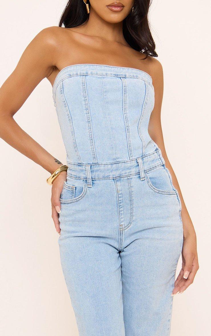 Bandeau Seam Detail Straight Leg Jumpsuit In Blue Denim