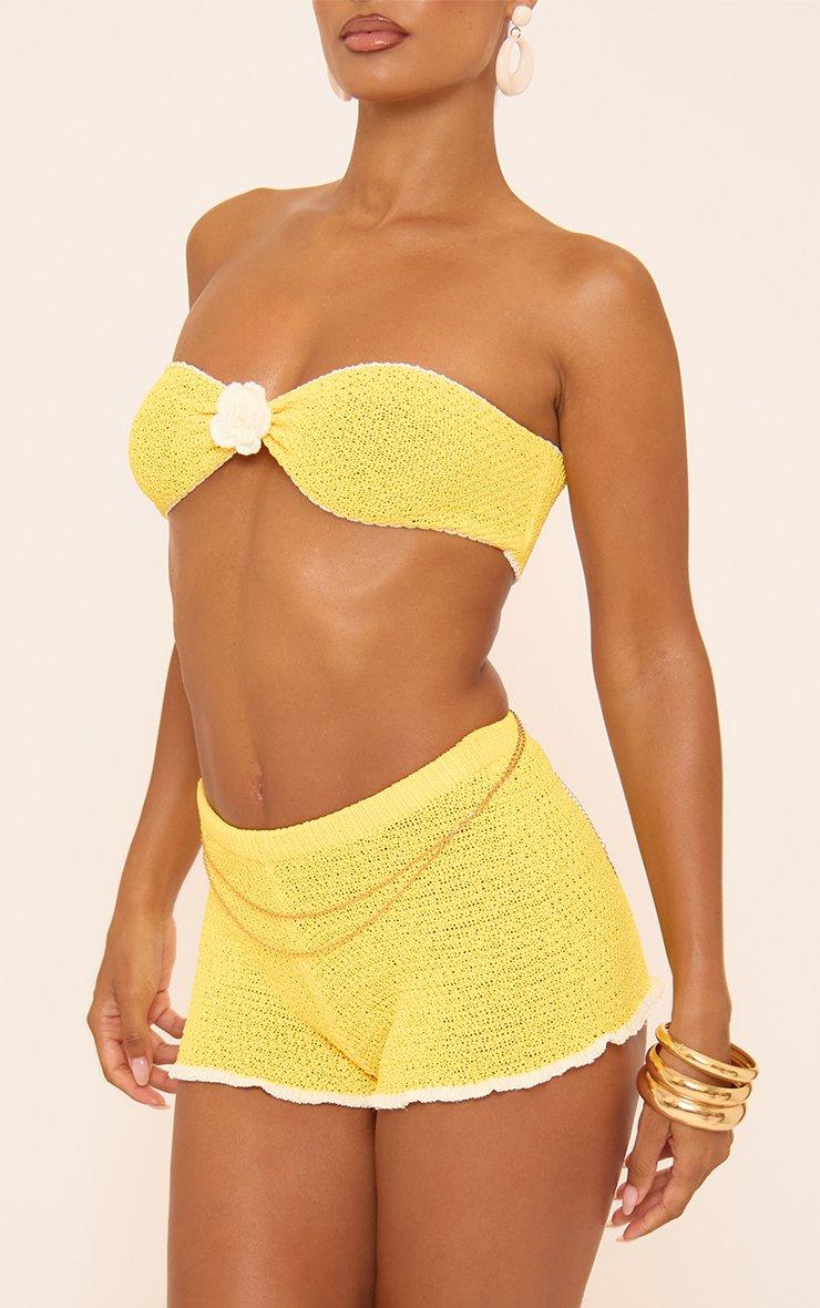 Mid Rise Ruffle Contrast Trim Shorts In Yellow Crochet Knit