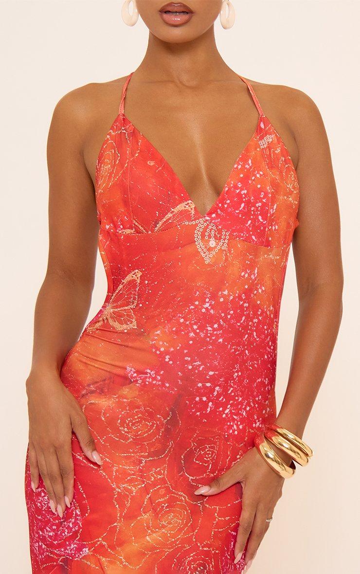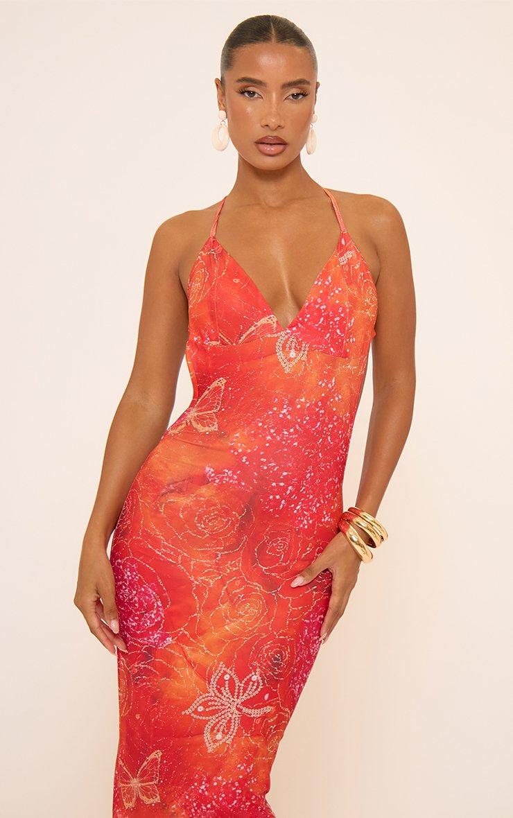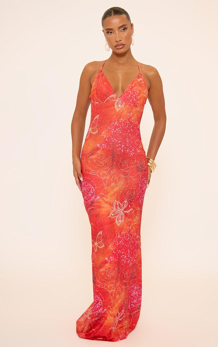 Strappy Plunge Maxi Dress In Orange Floral Metallic Print