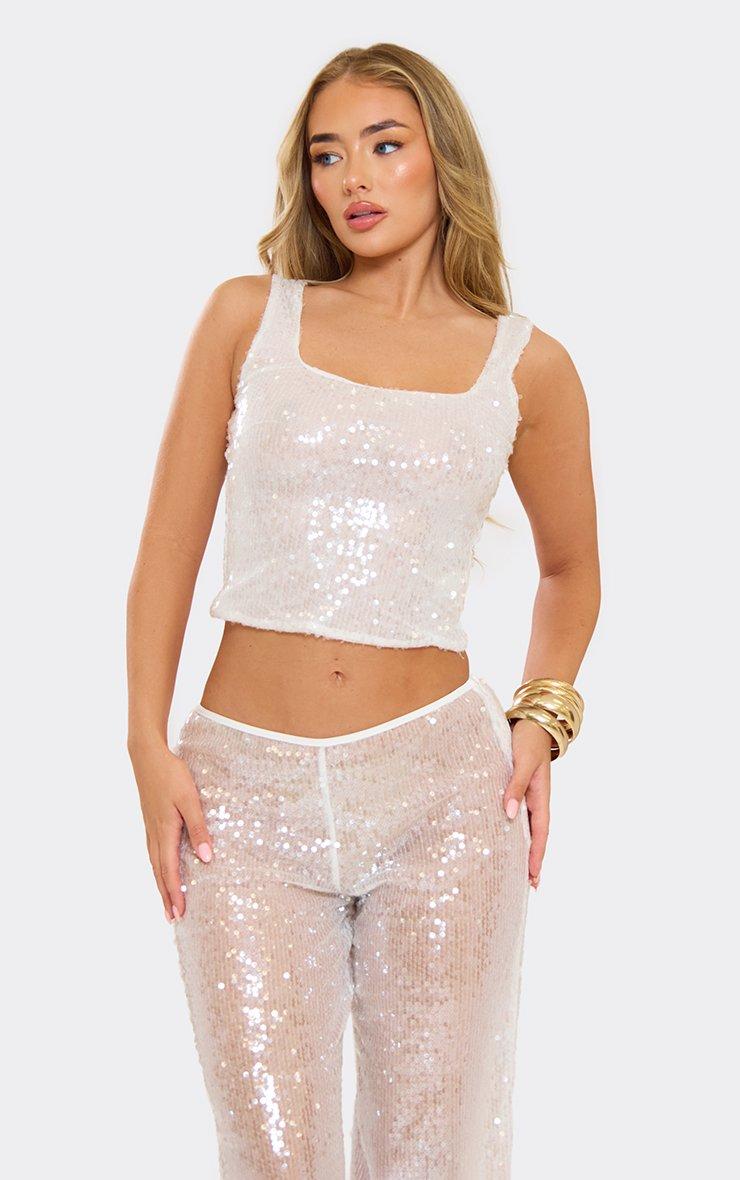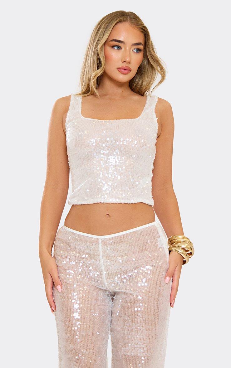 For party nights, this sleeveless top features dazzling white sequin material with a sleek square neck and subtle detailing—perfect to add that bold, chic vibe, doll.