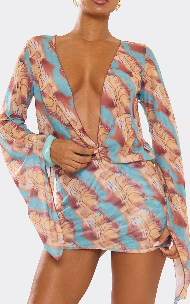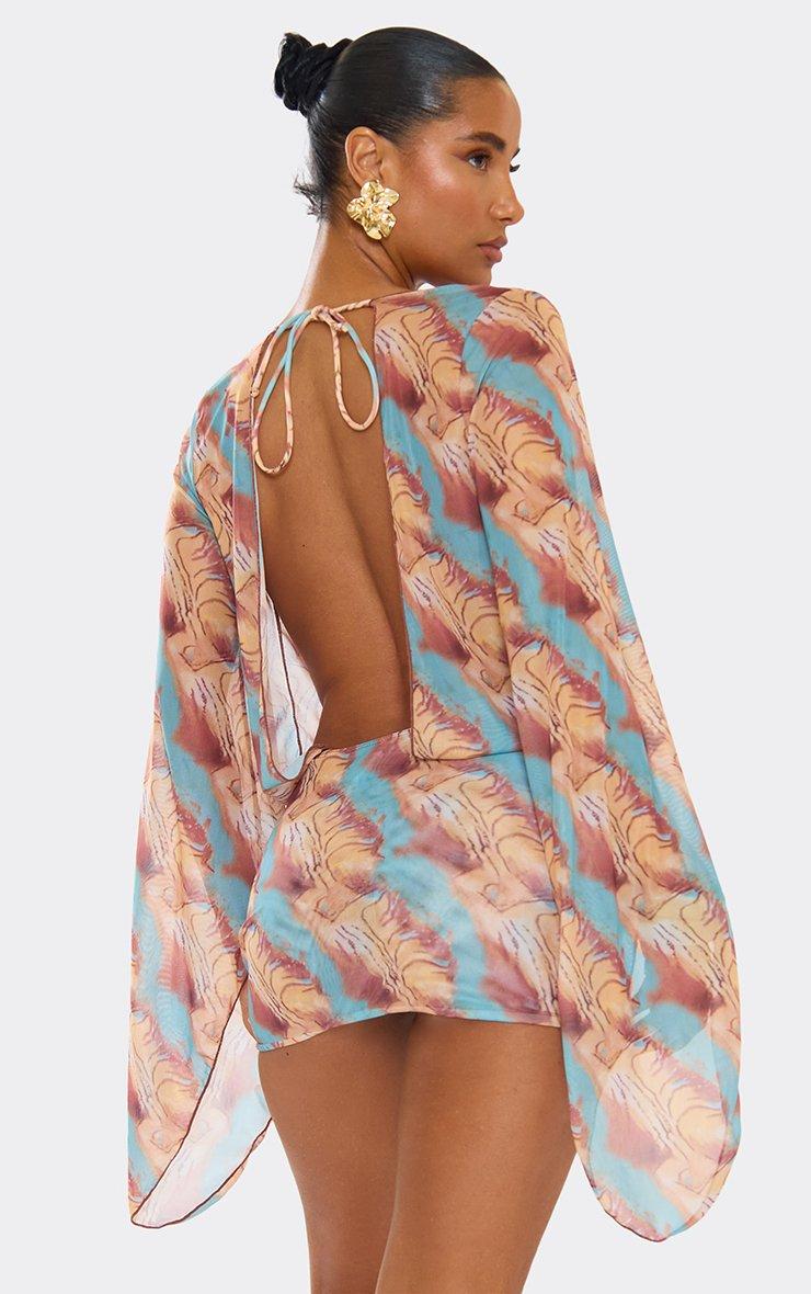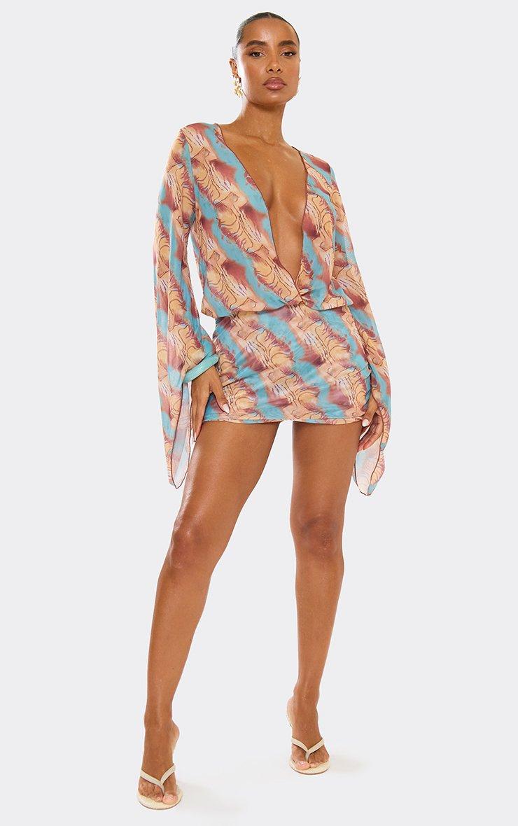 Flared Sleeve Extreme Plunge Mini Beach Dress In Multi Abstract Print
