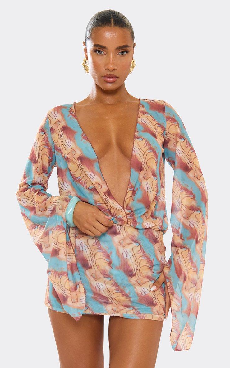 Sheer drama for sun-drenched days. This multi abstract print beach dress brings all the vibes with flared sleeves and an extreme plunge—your statement moment, served bold.