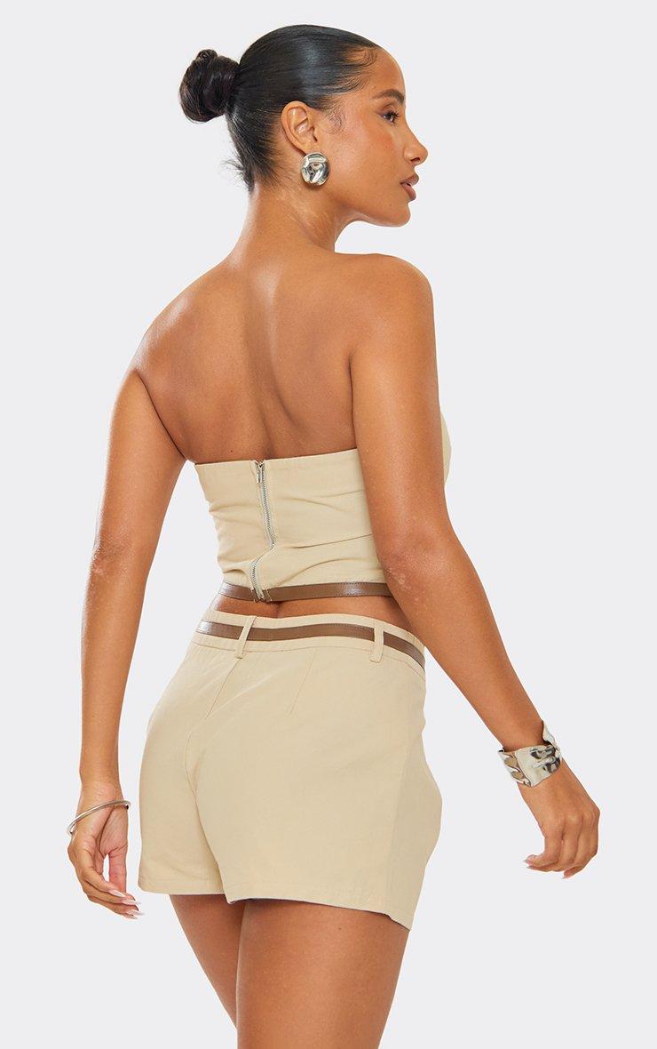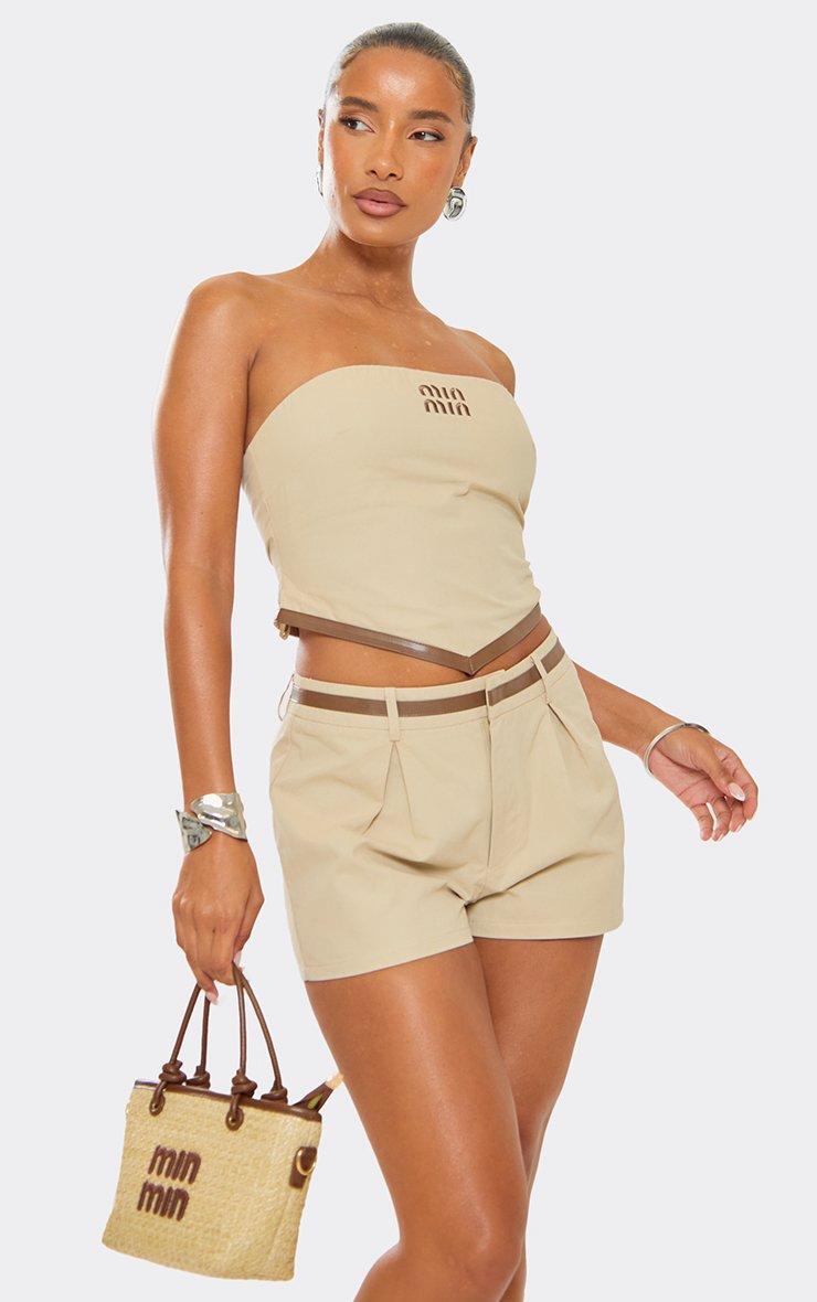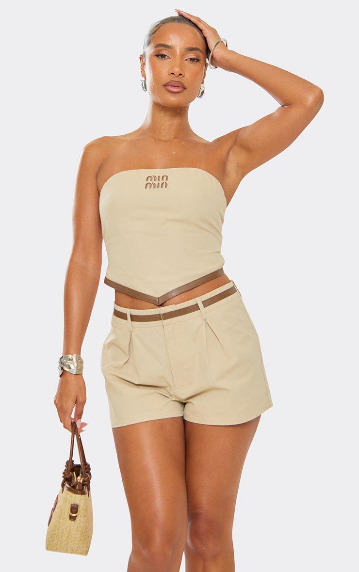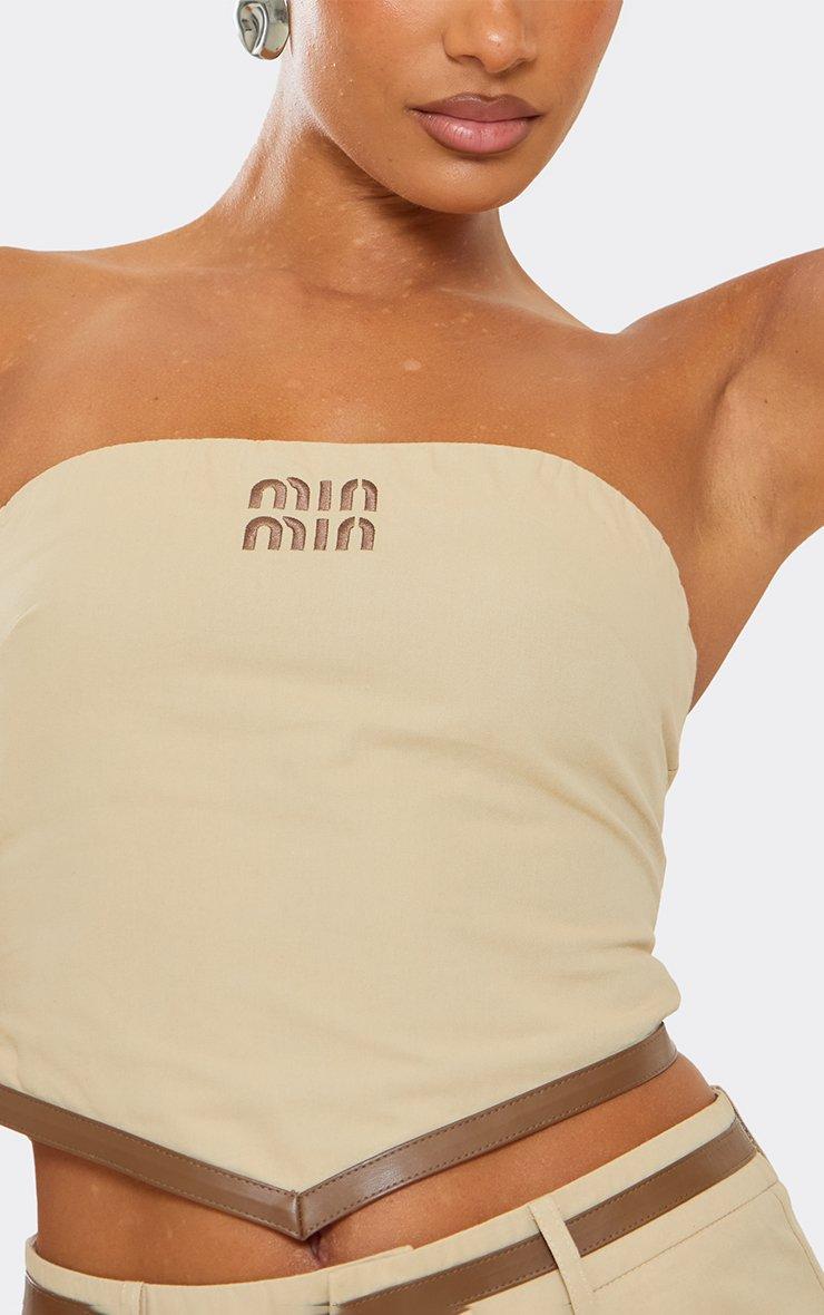 Bandeau Pointed Hem Faux Leather Trim Min Min Detail Top In Stone