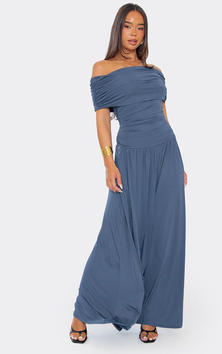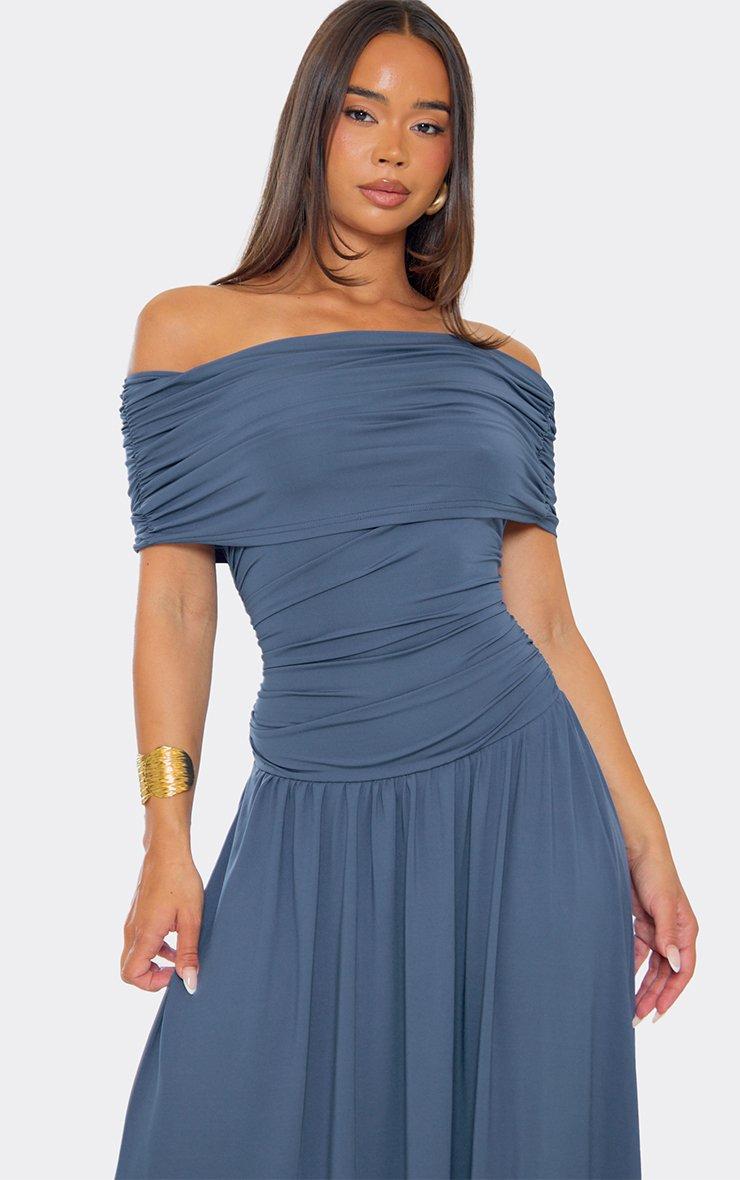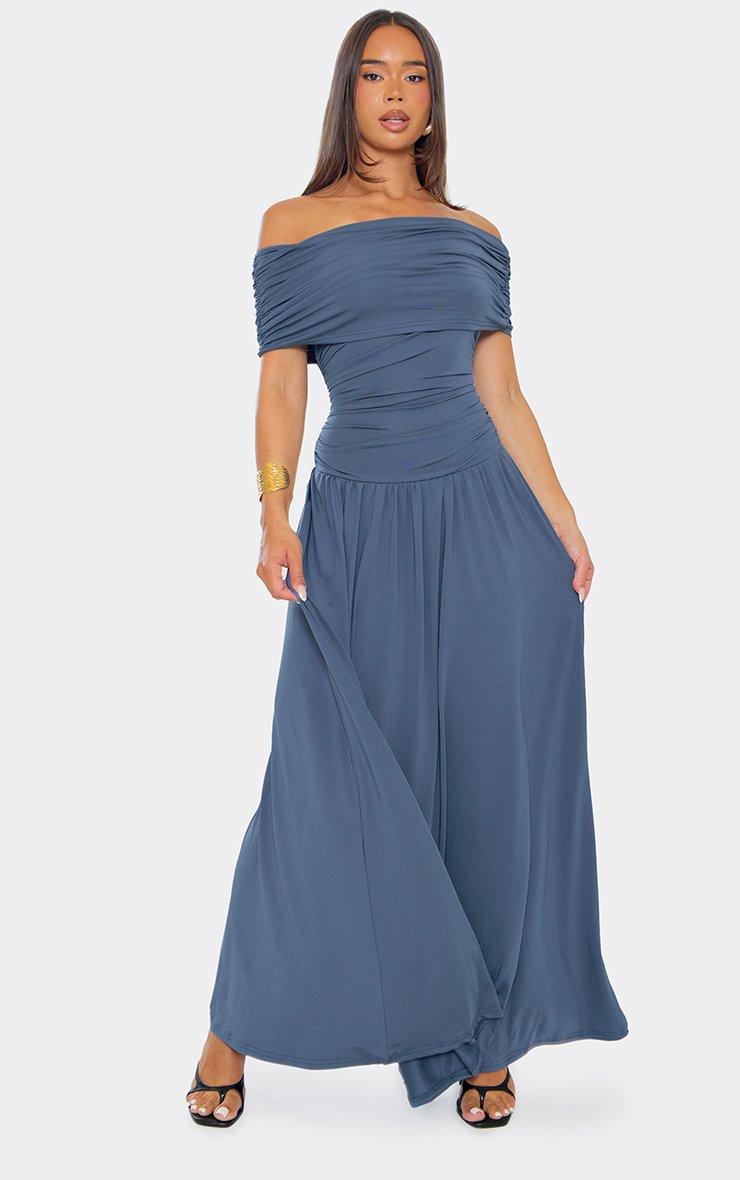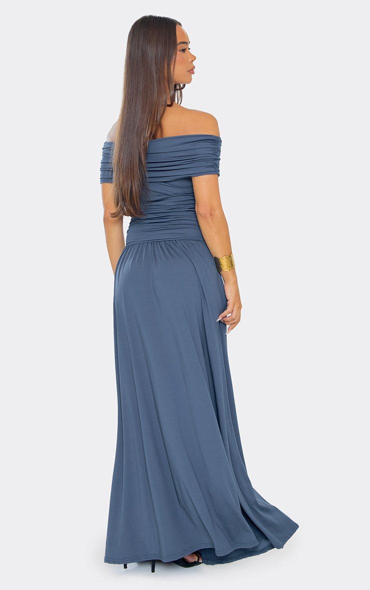 Serve weekend glam, doll. Featuring a blue material with bardot and dropped hem detailing, this maxi dress is giving chic, bold vibes from day to night.