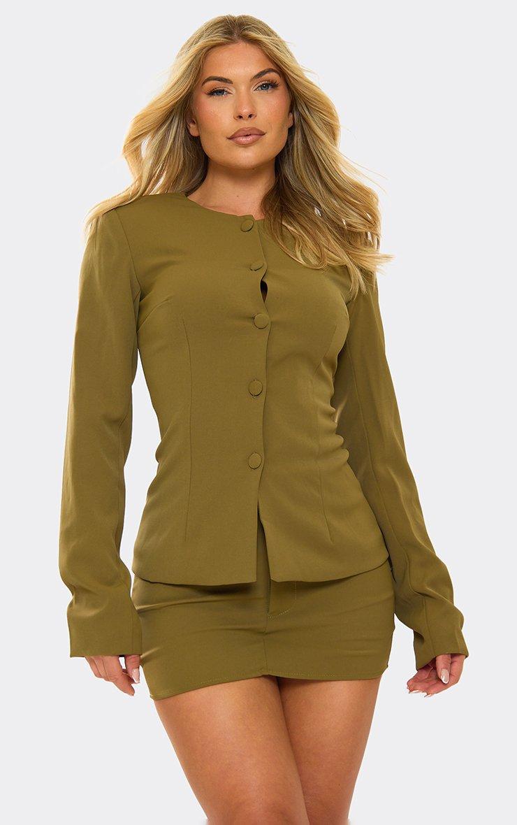 Long Sleeve Button Front Cinched Waist Tailored Blazer In Olive Green