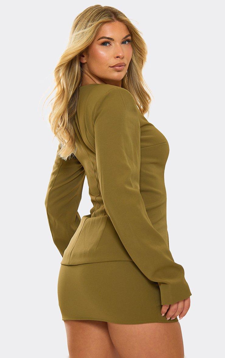Work or evening vibes, doll. Featuring an olive green material with button front and cinched waist detailing in a long sleeve tailored blazer design, this piece brings chic, polished energy to your look.