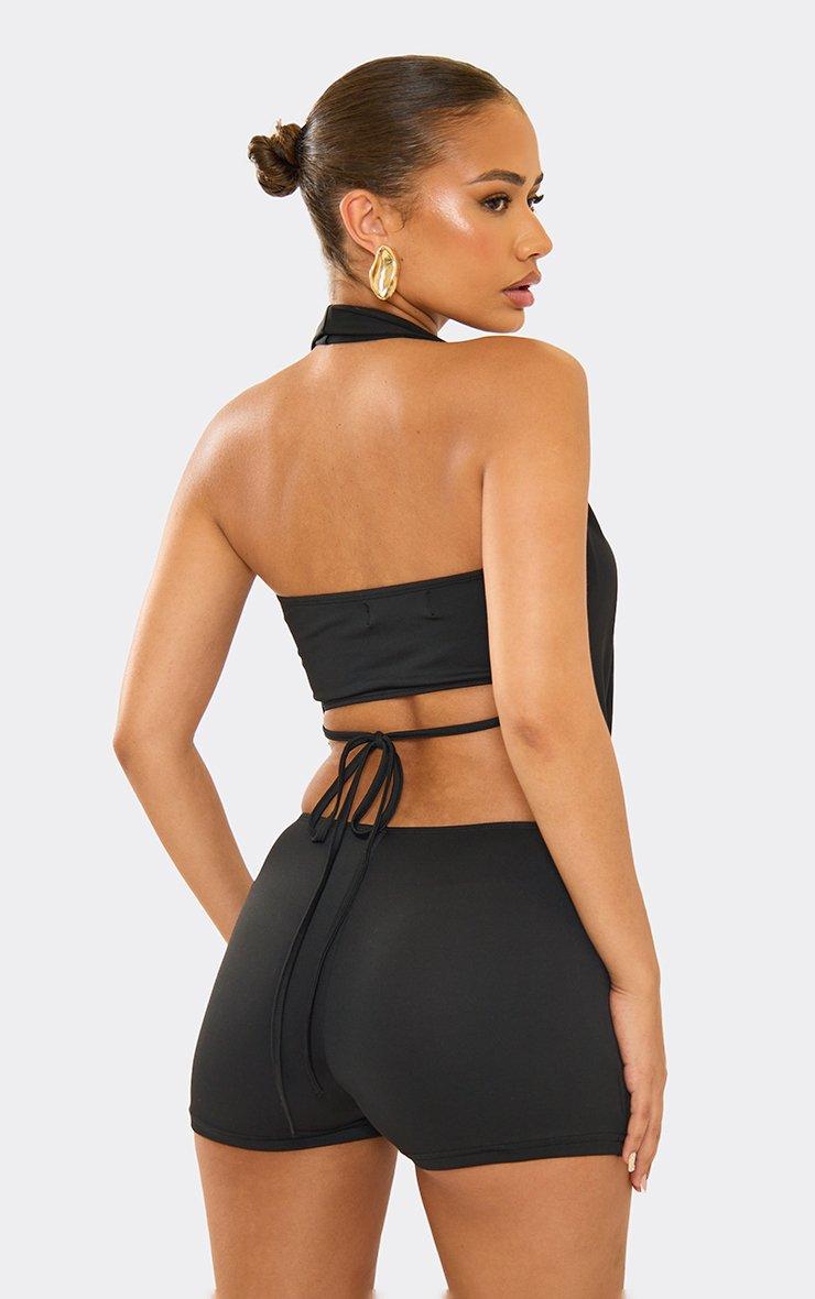 In need of night out outfit ideas? Here's one, this black halter-neck playsuit. Sleek and effortlessly chic, it features a draped cowl neckline and gold trim detailing for a sleek and sexy vibe. Designed with a fitted silhouette, this playsuit hugs your waist and skims your shoulders, creating a flattering shape that works perfectly for nights out. This black halter neck playsuit is a whole vibe when it's styled with gold bracelets and hoop earrings . It's a need. Key Features Black Colour Cowl Halter-Neck Design Trim Detailing Sleeveless Style Fitted Silhouette
