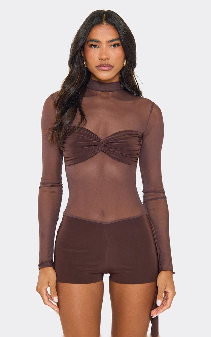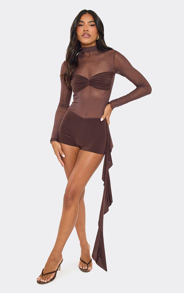 Night-out outfit ideas not hitting the way they used to? Refresh the rotation with this brown mesh detail playsuit. Sleek and statement-making, this playsuit features a high neckline, long sleeves, and contrasting mesh panels that add that extra edge. Designed with a body-hugging fit, it sculpts and shapes your silhouette while the drape detail brings a touch of movement. Make this your go-to by styling this brown mesh detail playsuit with gold barely-there heels , a shoulder bag , and gold jewellery . It's giving all the right vibes. Key Features Brown Colour High Neckline Long Sleeves Contrast Mesh Panels Drape Detail Body-Hugging Fit