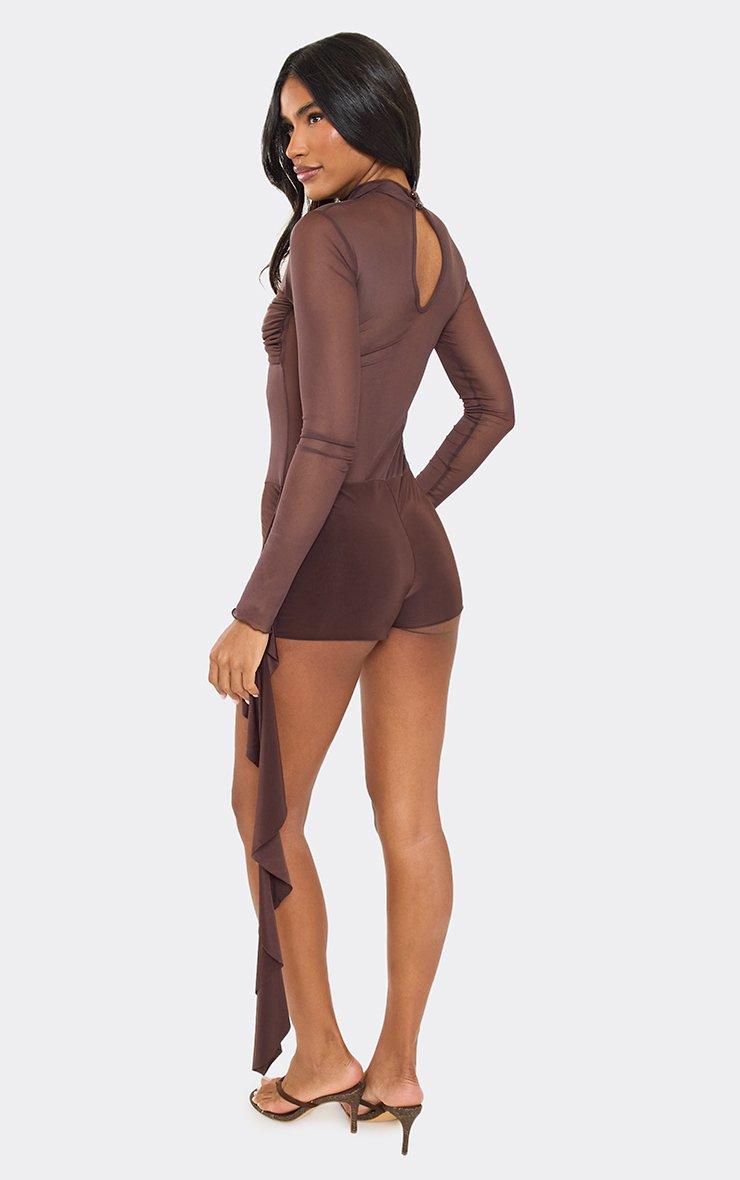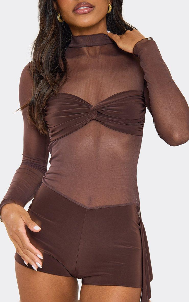 High Neck Long Sleeve Contrast Panel Drape Detail Playsuit In Brown Mesh