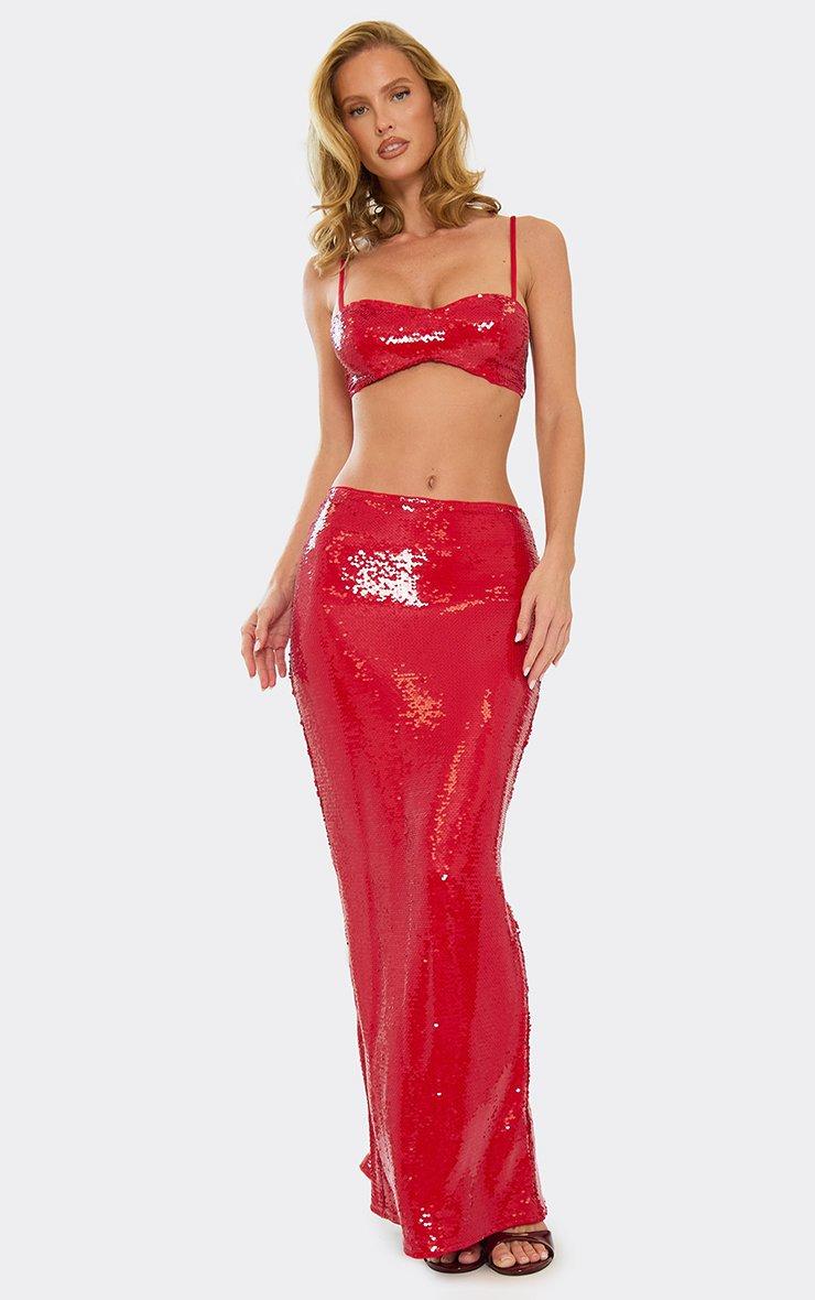Turn up night-out vibes, doll. Featuring red sequin material with strappy and bralet detailing, this piece brings bold it-girl energy. Style with high-waist trousers or a mini skirt and heels for boss-babe looks.