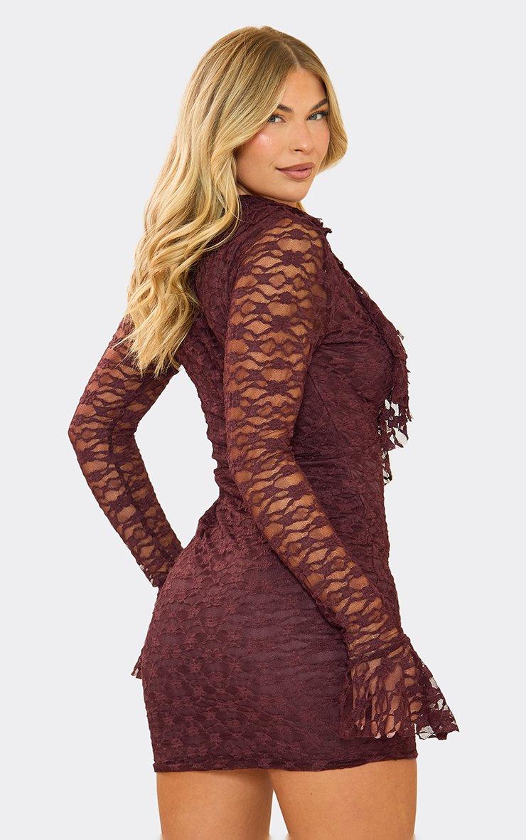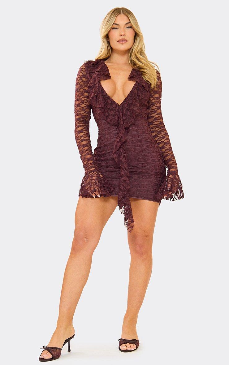 Frill Long Sleeve Plunge Draped Detail Mini Dress In Chocolate Brown Lace