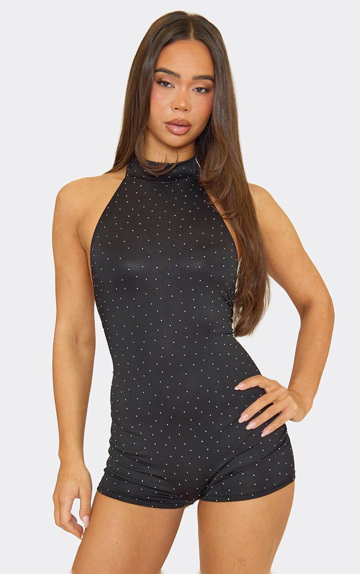 High Neck Hotfix Diamante Playsuit In Black