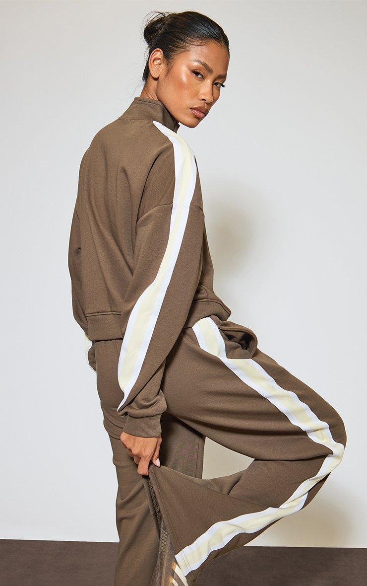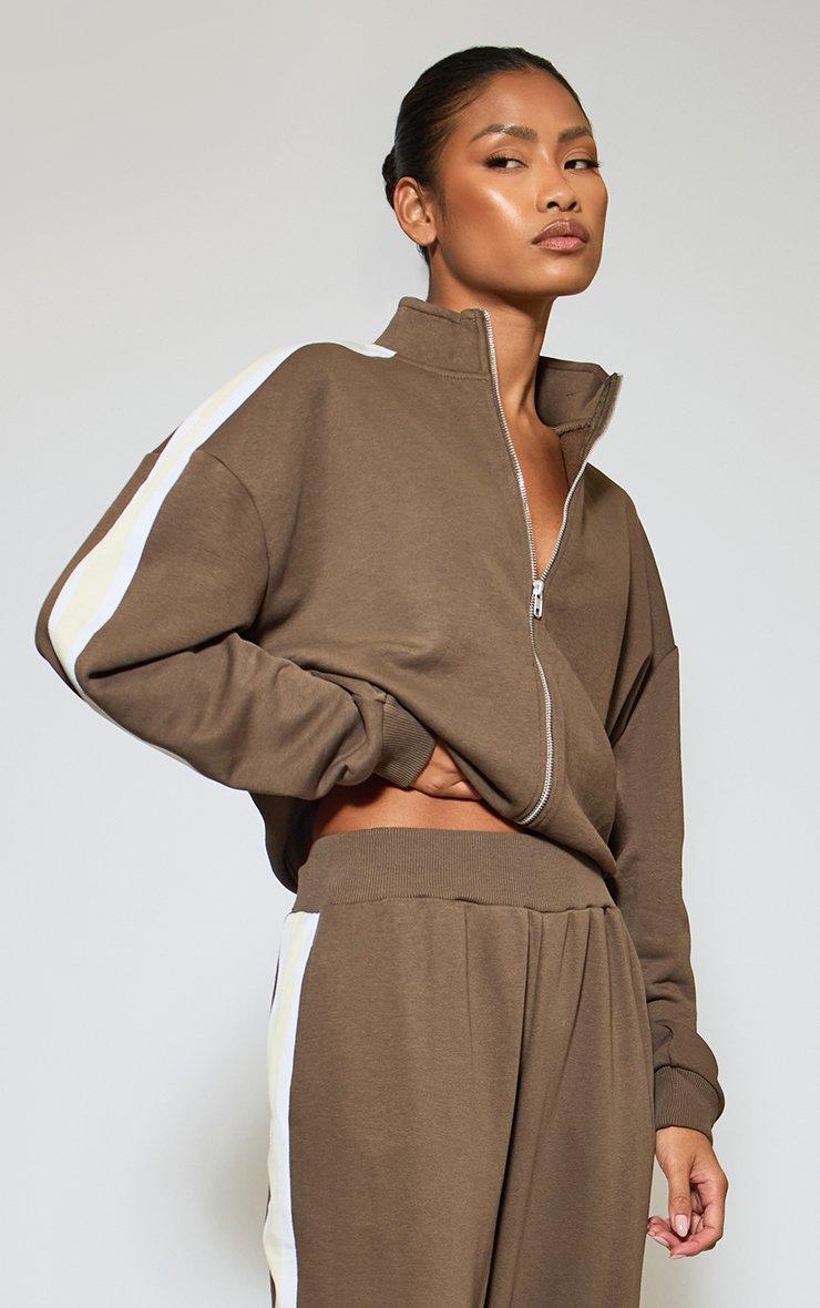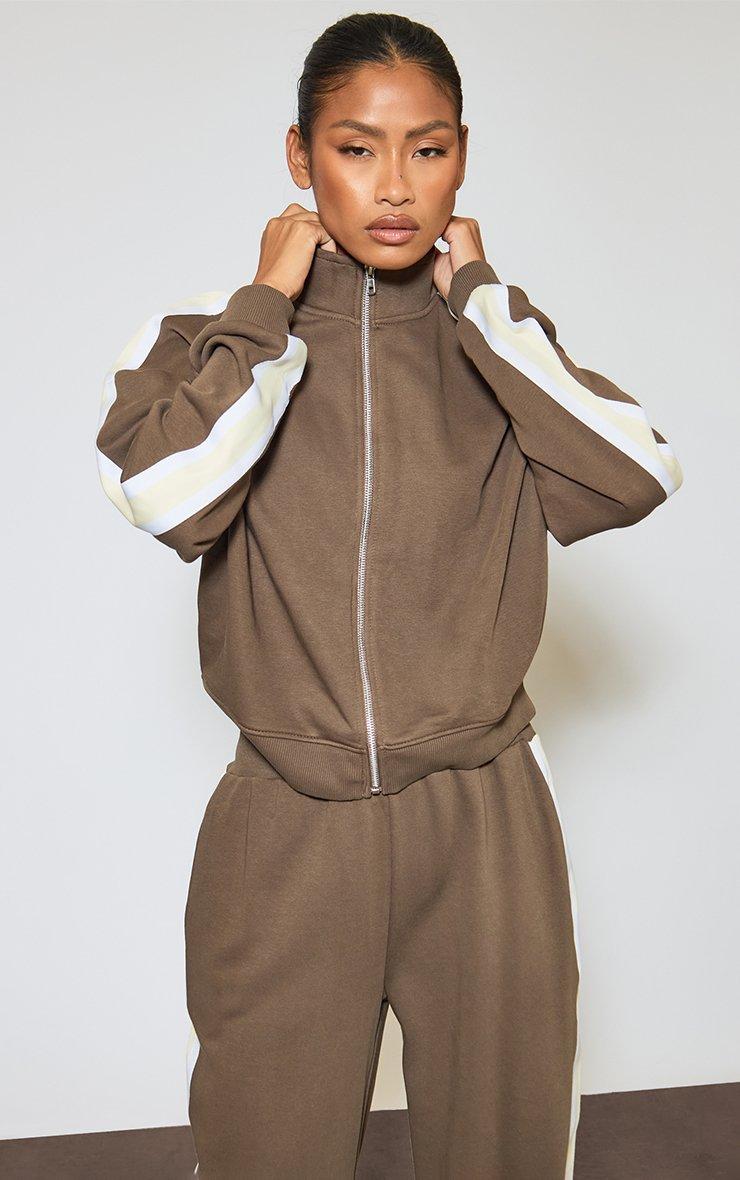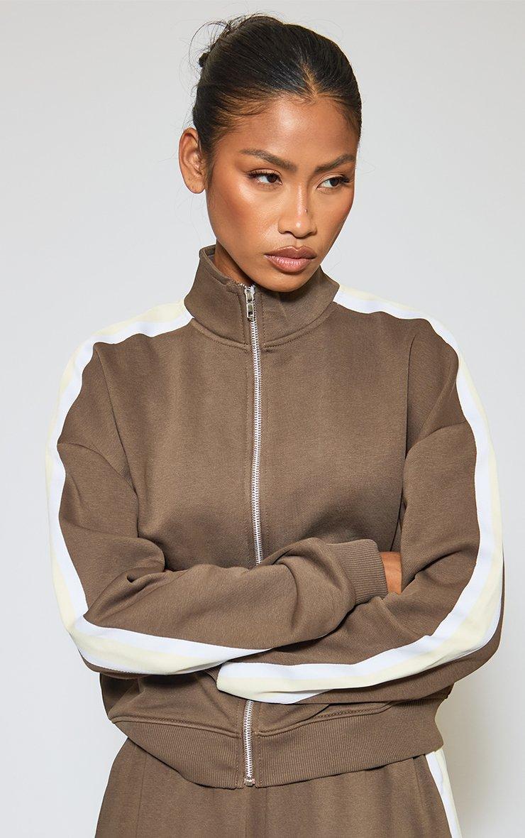 Stay ahead of the game with this season's hottest sport-luxe essential. Featuring brown sweat material with contrast stripe and high neck zip-up detailing. This edgy layer is a total must-have for a snatched off-duty look that screams boss-babe.