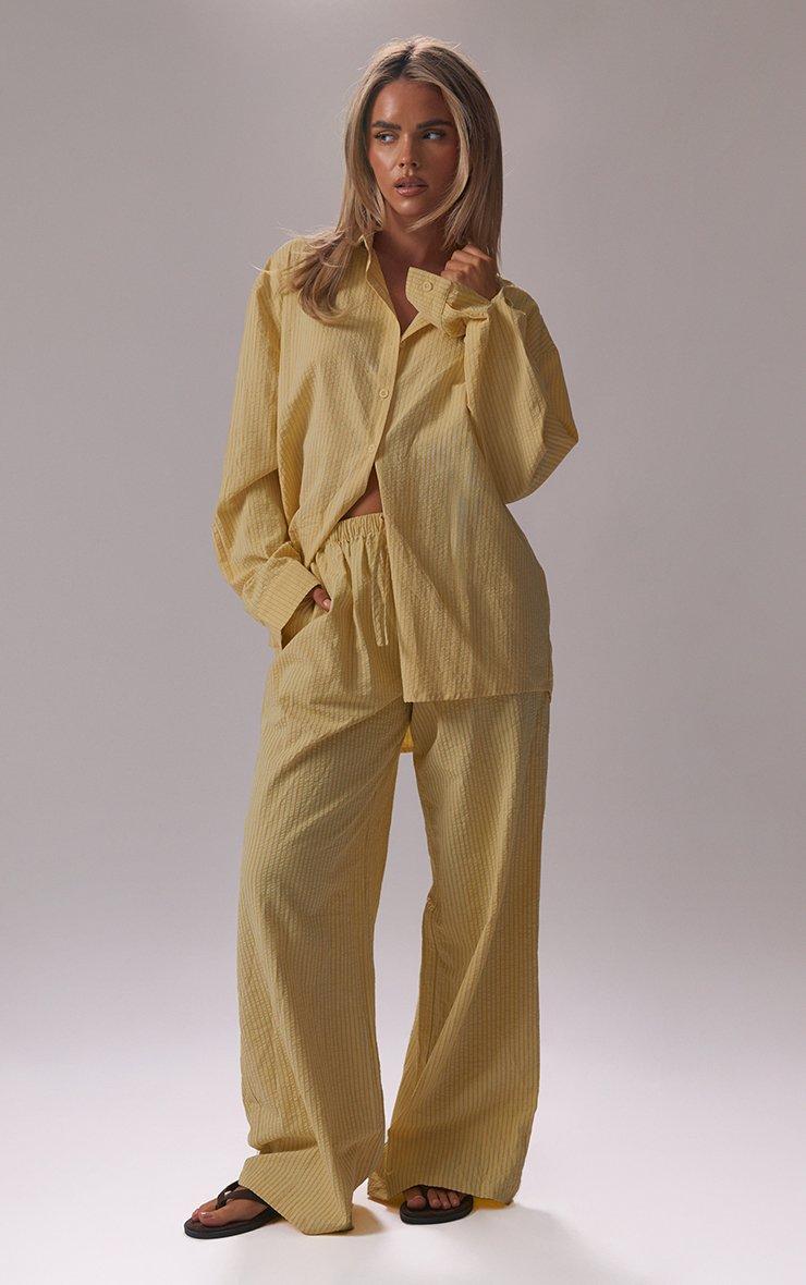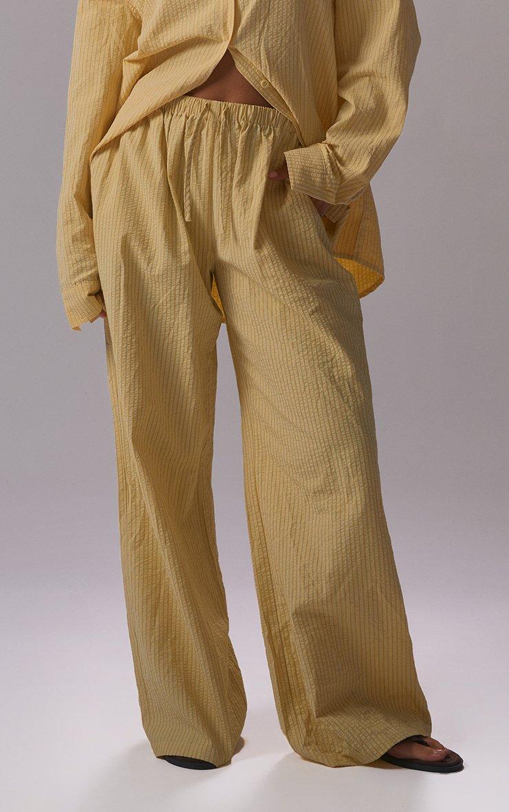 Upgrade your spring holiday wardrobe. Featuring lemon stripe crinkle poplin material with drawstring waist and wide leg detailing. Team with a matching crop top and chunky sandals for a look that is totally on-trend.