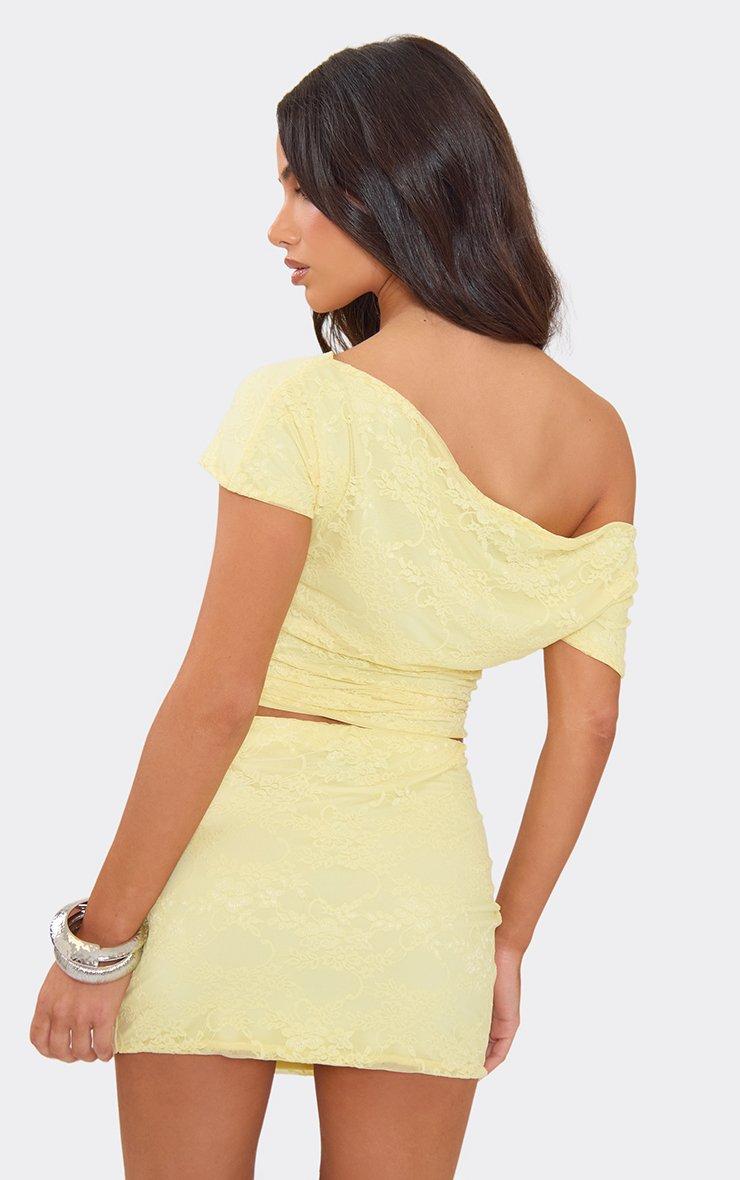 Refresh your summer rotation with this mid-rise mini skirt, doll. Featuring a vibrant lemon yellow lace fabric with a sophisticated micro silhouette and a sharp, textured fit, it brings a fresh, artisanal edge to your look. Style with the matching one-shoulder top and white kitten heels for a clean-chic aesthetic.