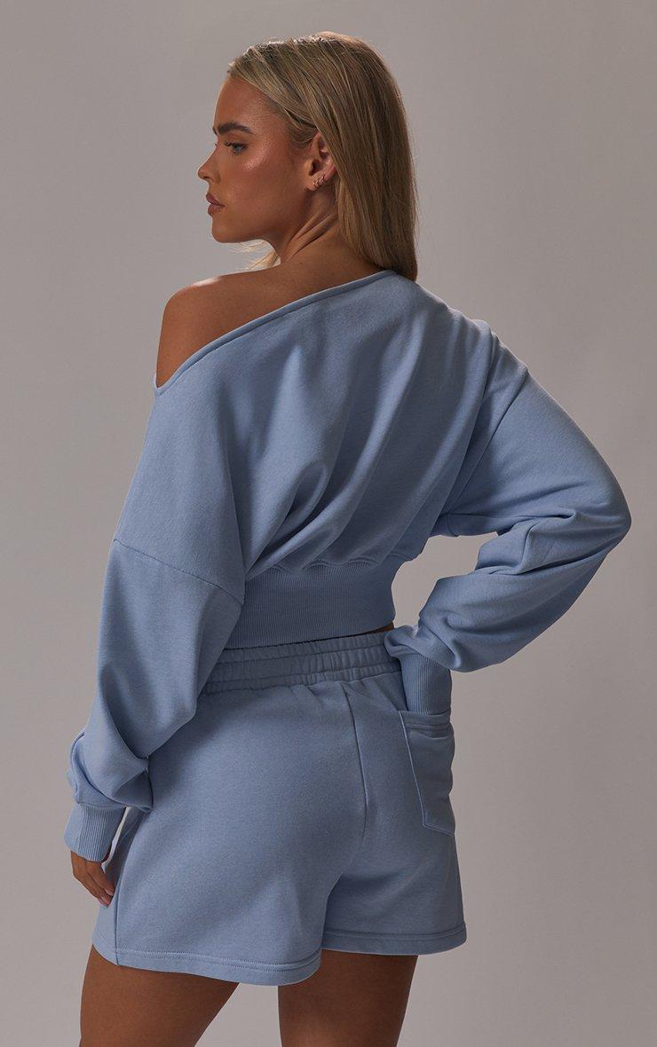Upgrade your off-duty look for those chill spring days. Featuring blue sweatshirt material with off the shoulder and cinched waist detailing. Style with matching joggers and fresh trainers for a vibe that is totally on-trend.