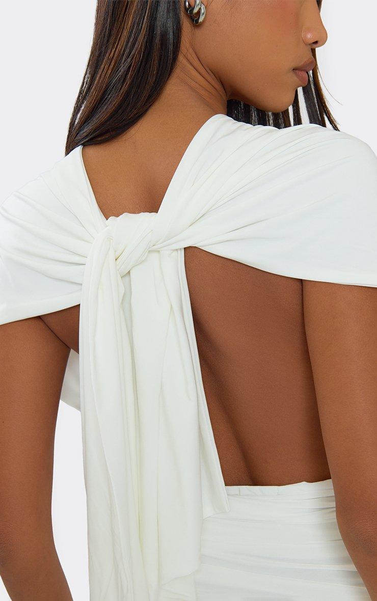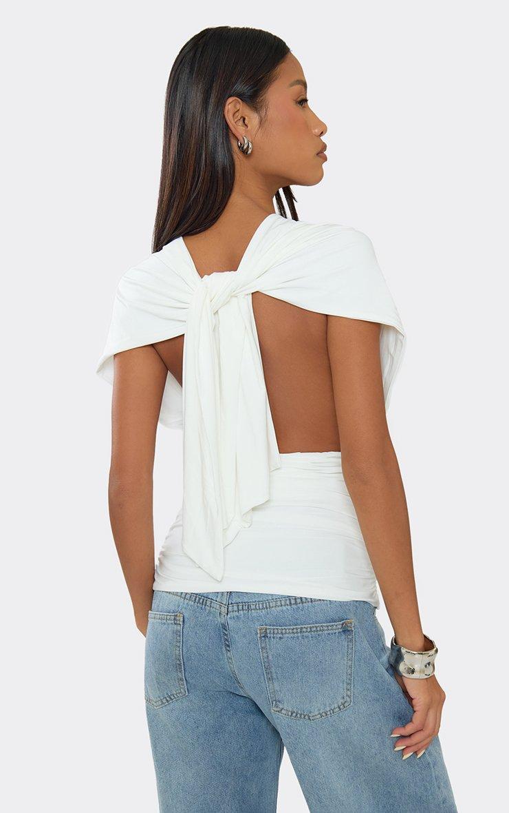 Refresh your summer rotation in white slinky material featuring short sleeve, plunge front and tie back detailing. This sharp, high-octane top delivers a total "clean girl" aesthetic for an it-girl finish. Style with blue denim and silver hoops.