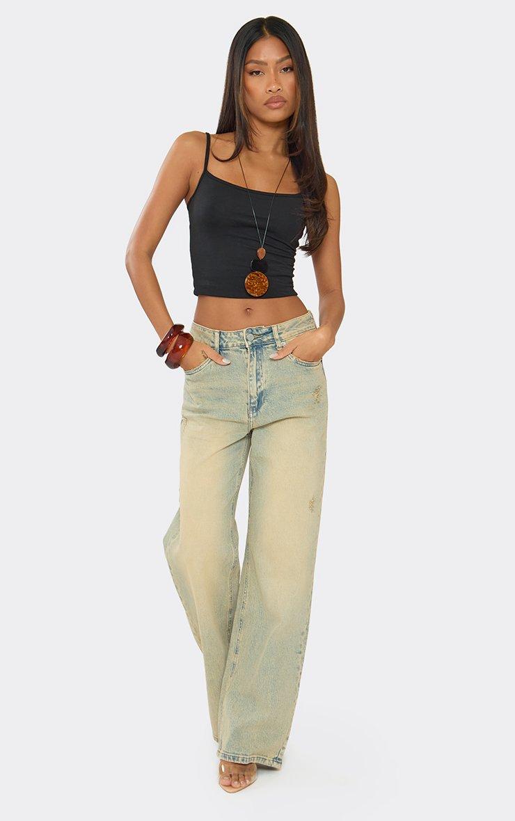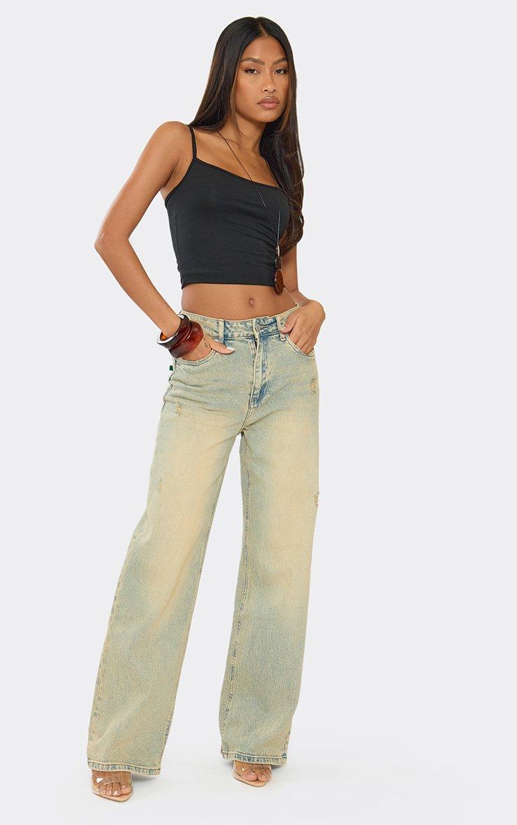 Mid Rise Distressed Wide Leg Jeans In Vintage Wash Blue Denim