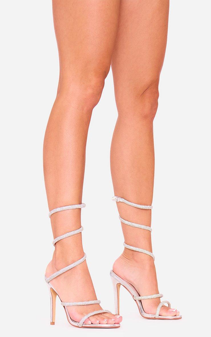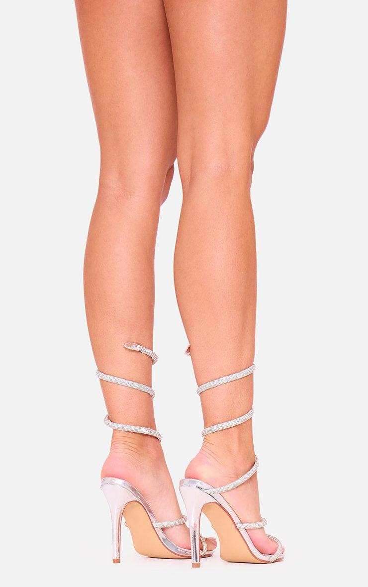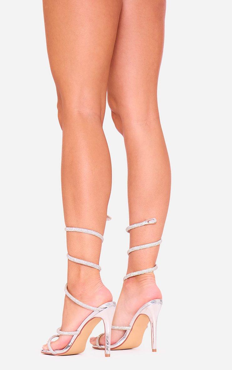 Step up your glam game with silver faux leather featuring riser diamante wrap-around strap detailing — these stiletto heels bring chic sparkle and bold attitude, doll.