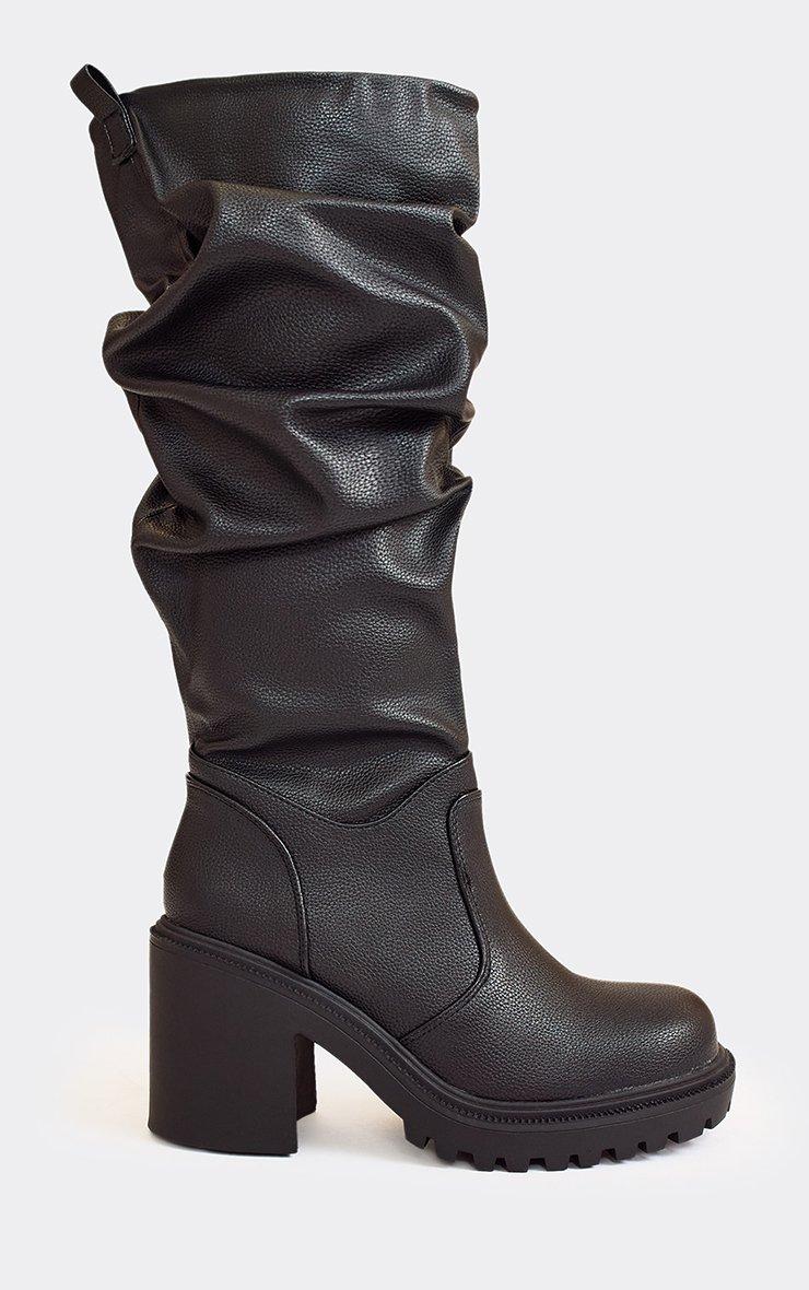 Own every street style moment this season. Featuring black faux leather material with slouched knee-high detailing and a chunky block heel, these boots bring bold, cool-girl vibes to any outfit.