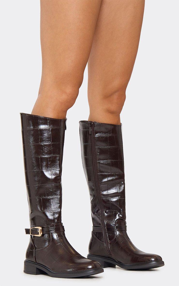 Hit weekend-chic vibes, doll, featuring a brown check print faux leather material with buckle and knee high flat detailing, these boots serve bold, stylish energy with attitude.