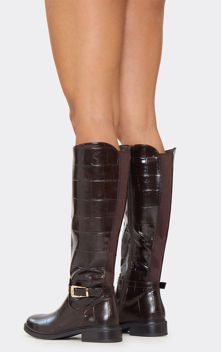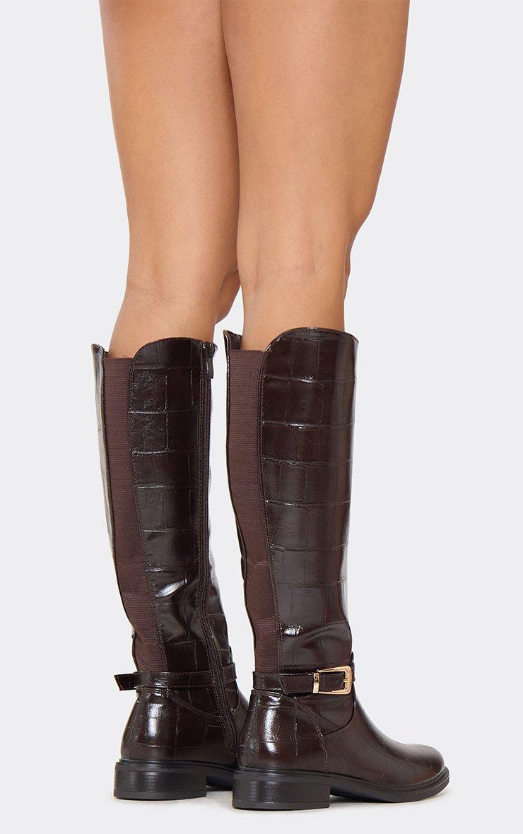 Jarnex Buckle Detail Knee High Flat Boot In Brown Check Print Faux Leather