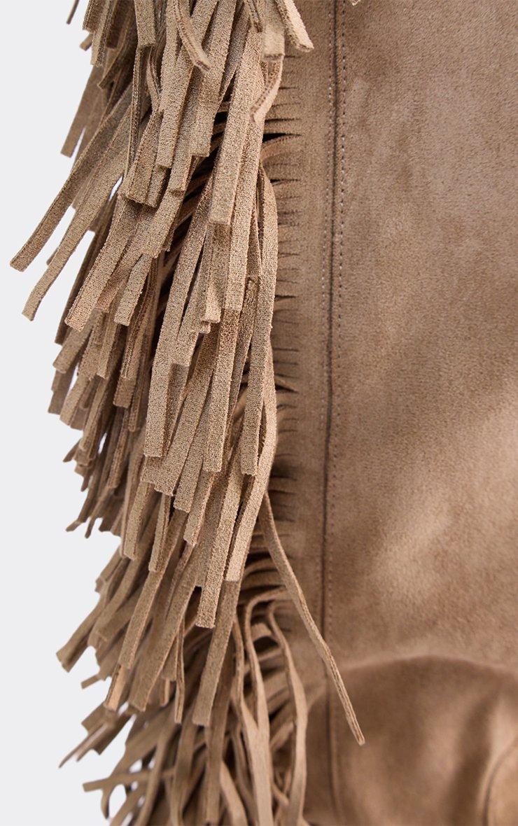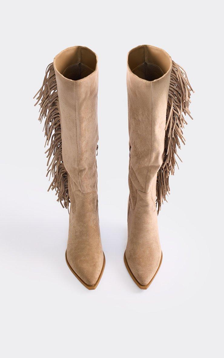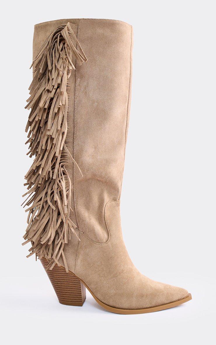 Alone Pointed Toe Side Tassel Detail Block Heel Knee High Boot In Taupe Faux Suede